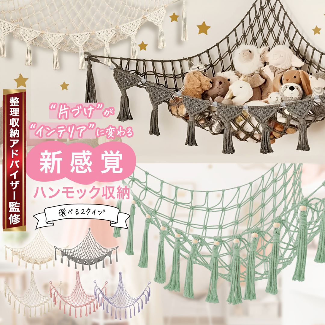 【 BLACK FRIDAY限定☆20時〜ポイント10倍 !】ぬいぐるみ 収納 ハンモック【整理収納アドバイザー監修/穴が目立ちにくいフック付き】 吊り下げ おしゃれ インテリア 壁掛け 子供部屋 リビング ワンルーム ぬいぐるみハンモック ウッドビーズ フリンジ 北欧インテリア |