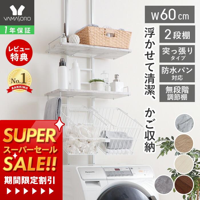 【1年保証&当店限定特典付】かご付き ランドリーラック 突っ張り式 洗濯機ラック 洗濯機上 収納 幅60 スリム 棚 ラダー はしご 棚2段 かご 防水パン対応 バスケット付き 可動 大理石柄 ウォールラック 壁面 カゴ付き エコー Echo |
