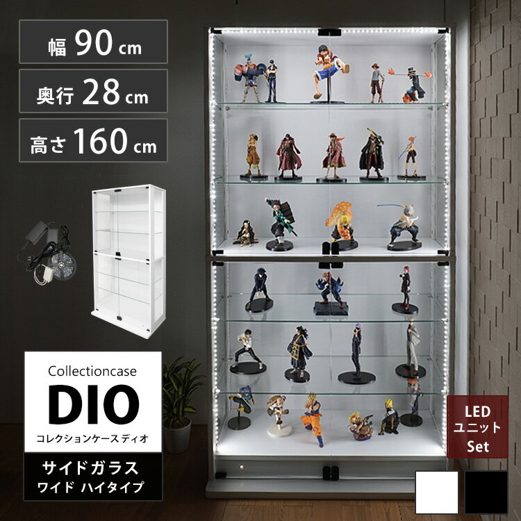 コレクションラック 側面ガラス DIO ディオ ワイド ハイタイプ 鍵付 LED付き セット NEW コレクションケース ガラスケース ディスプレイラック ( 幅90cm 奥行28cm 高さ160cm タイプ 中型 ホワイト , ブラック ) |