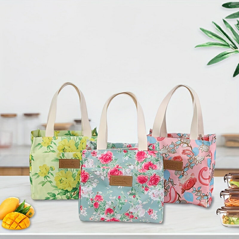 1個入り、断熱ランチトートバッグ、オックスフォードクロス、花柄、20cm X 16cm X 23cm、ピクニック、仕事、家庭の台所用ポータブルクーラーバッグ