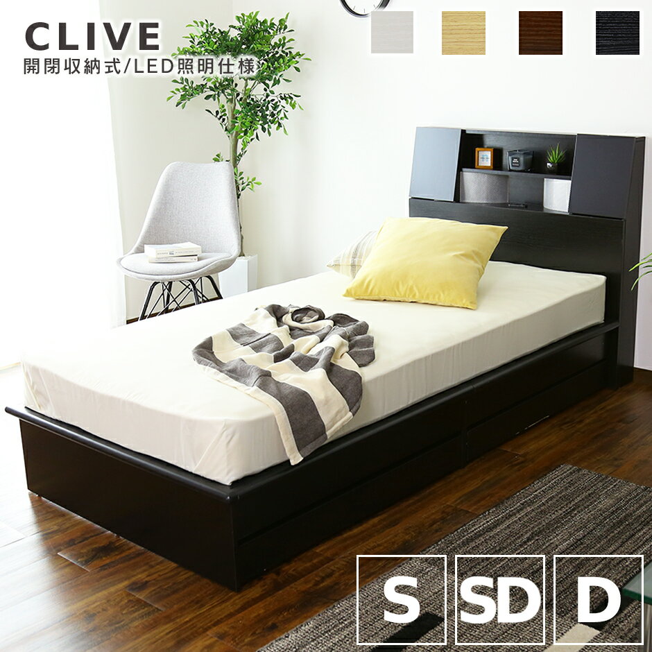 【クーポン10%off 1/28 26時まで】 収納ベッド シングル 幅140 引き出し 引出し収納付き スライド収納 ベッドフレーム コンセント 2口付き スマホ充電 扉付き ベッド 収納 引き出し付き 木製 宮棚 棚付き LEDライト照明付き ベッド シック クライブS ドリス